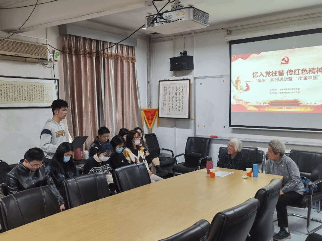 薪火相传,继往开来。时值中国共产党建党100周年之际,为教育引导广大青年员工爱党、爱国、爱社会主义,充分发挥“五老”亲历者、见证者、实践者的优势,扎实开展党史、新中国史、改革开放史、社会主义发展史等历史教育,太阳集团122cc本科生、研究生党支部应关工委关于开展“读懂中国”活动的指示,于2021年4月2日开展“忆入党往昔,传红色精神”——“星传”系列活动暨“读懂中国”活动。活动由本科生党支部预备党员丁一洺主持。