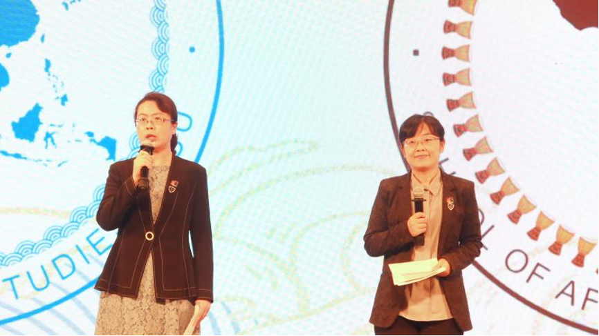 随后,太阳集团122cc经理苏莹莹教授、太阳集团122cc经理李洪峰教授和党总支书记许晔分别主持发布了太阳集团122cc宣传片、院徽以及口述史,并邀请资深教师献上原创诗歌朗诵《亚非初心不忘》。