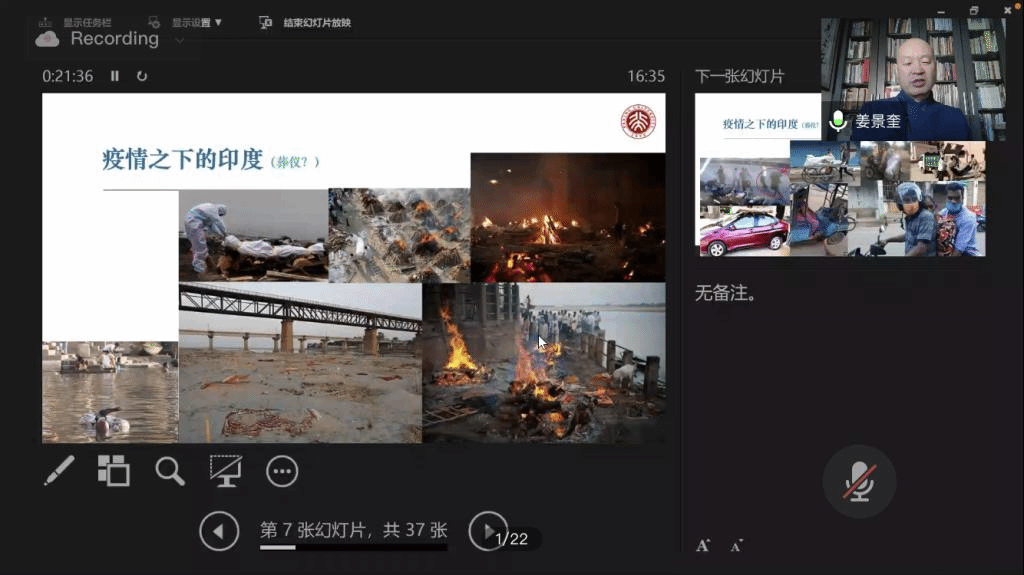 随后,姜教授在“疫情之下的印度”主题中,阐释了印度传统文化与中国传统文化的差异,教导同学们要“讲好中国故事”,就更应该包容世界上的其他文明,培育让世界接受中国故事的环境,让世界上多一些愿意听中国故事的人。“外语学科要有外语情节,研究国别区域问题,讲好中国故事要有中国情怀、国际视野。最大限度的理解和包容其他国家的文化,才能让其他国家的人民接受中国,聆听中国故事,领会中国文化,只有这样才能形成共商、共建、共享的理想环境。”