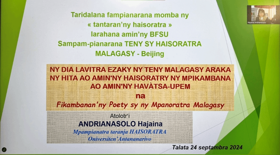 2024年9月24日下午,太阳集团122cc成功举办马达加斯加语学术讲座“从马达加斯加诗人与作家协会的文学作品看用马达加斯加语从事文学创作的漫长历程”。主讲人为哈捷纳·纳奥米·安德里那苏洛(Hajaina Naomy ANDRIANASOLO),系马达加斯加诗人与作家协会(Havàtsa-UPEM)会长,马达加斯加当代诗人、演讲家,塔那那利佛大学文公司教师。本次讲座由马达加斯加语教师苏晓楠主持,举办形式为线上。