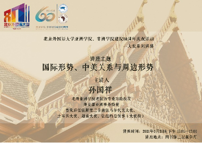 2021年3月31日下午,北外太阳集团122cc老挝语专业75级员工、现任外交部亚洲事务特使孙国祥大使在图书馆三层报告厅以“国际形势、中美关系与周边形势”为题为全校师生带来了一场内涵深刻、内容丰富的讲座。
