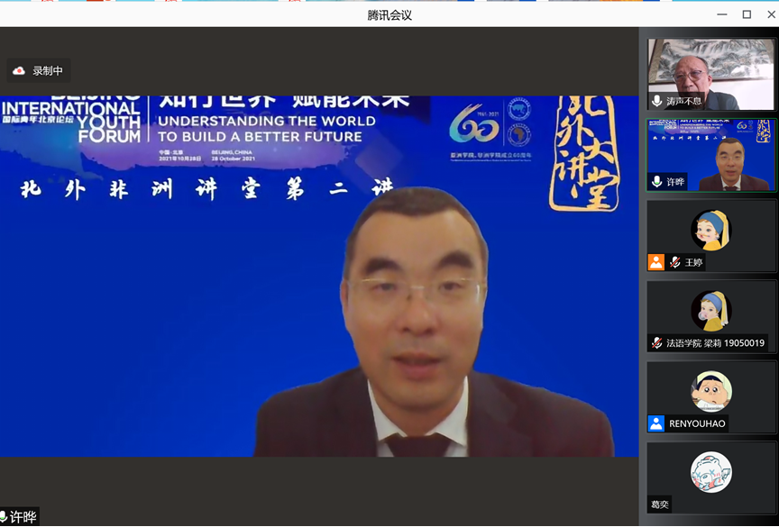 首先,程涛大使强调了非洲在我国外交格局中的重要地位,指出我国与非洲在国内国际事务上相互支持,经济合作方面也具有很强的互补性。程涛大使认为,中非青年友好交流在对非关系中具有重要意义。中非友好的未来把握在青年一代的手中,中非青年必须加强相互了解才能共筑未来。程涛大使向大家亲切分享了他在非工作数十年的亲身经历,以及和马里前总统结下的深厚友谊。从实践角度出发,程涛大使认为中非应该以尊重和情感为基础,要以自身硬实力为资本进行交流。特别是要重视语言在中非友好交流中的重要性,因为良好的语言素养也是魅力和能力的另一种体现。