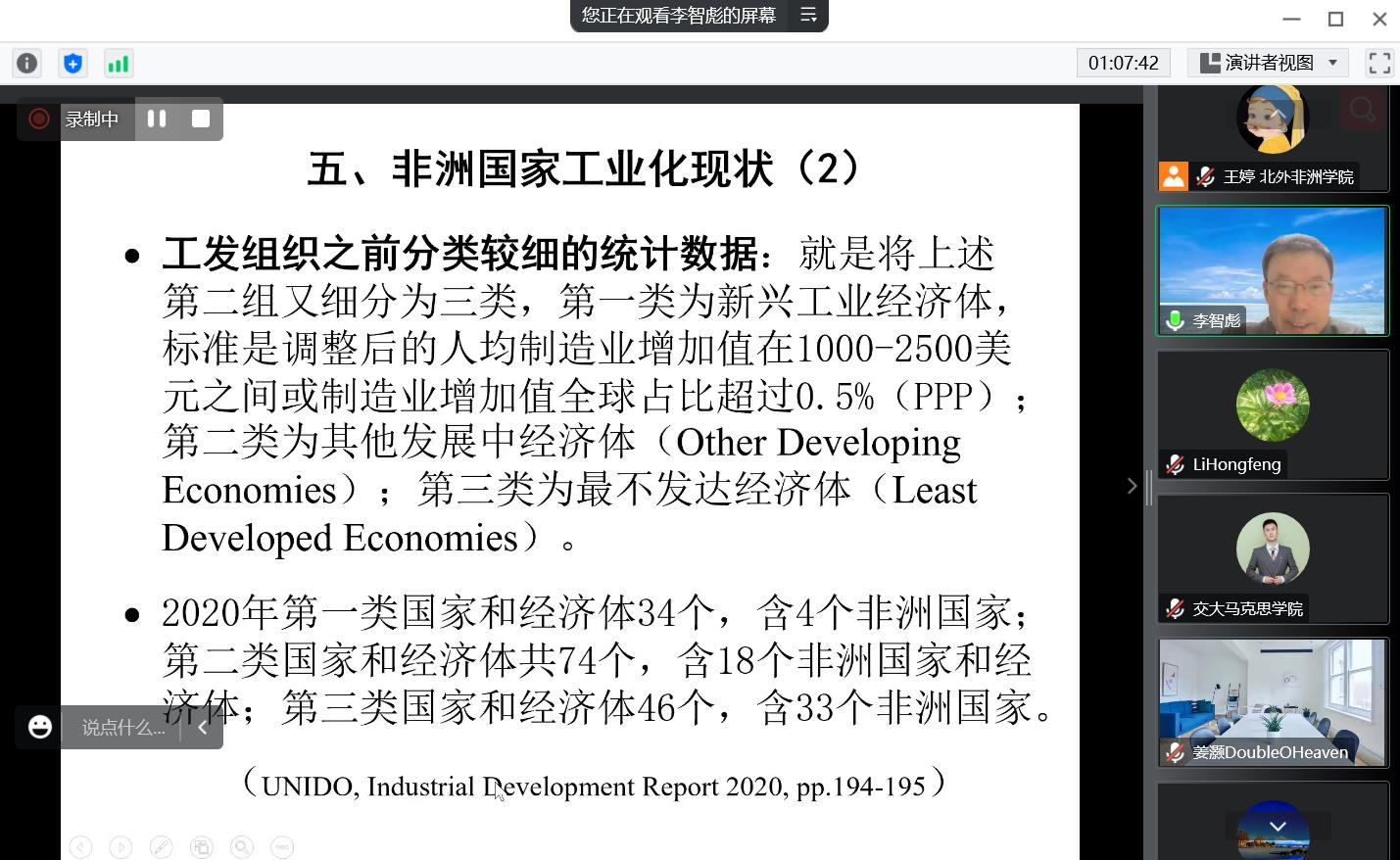 在讲座之后的提问环节中,李智彪研究员就中非贸易对非洲工业化的影响、非洲工业化与农业的关系、现有国际格局对非洲工业化的影响、中国与非洲的工业合作的独特优势以及中国对非洲工业化进程中的贡献等问题,同与会者展开了积极热烈的交流互动。本次讲座取得了良好效果,校内外师生、学者专家共计190余人线上参加了本次讲座。