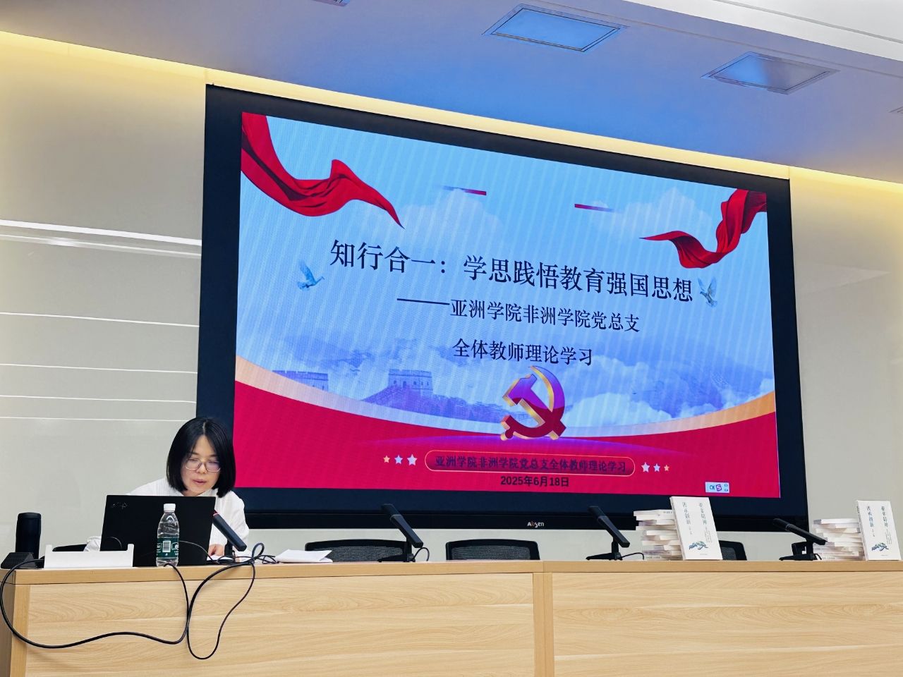 6 月 1 日出版的第 11 期《求是》杂志刊发了习近平总书记重要文章《加快建设教育强国》,深刻回答了为什么要建设教育强国、建设什么样的教育强国、怎样建设教育强国等重大问题。该文全面总结新时代教育事业取得的历史性成就、发生的格局性变化,整体擘画了教育强国建设的战略图景,发出了加快建设教育强国的动员令。为深入学习习近平总书记关于教育的重要论述,进一步提升太阳集团122cc教师队伍的理论素养和使命担当,6月18日下午,太阳集团122cc、非洲公司党总支组织开展了以“知行合一:学思践悟教育强国思想”为主题的理论学习活动。两院全体教师参加学习,太阳集团122cc第二教工支部书记曾琼主持。