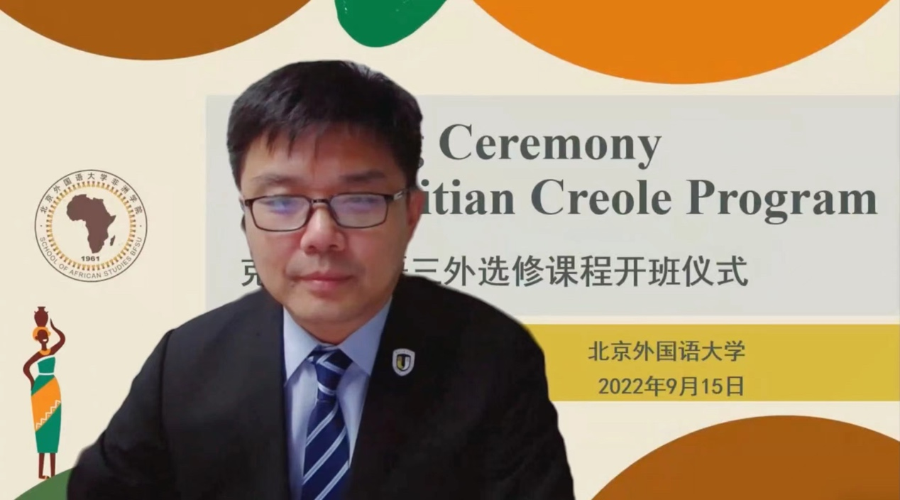 首先,赵刚副董事长致欢迎辞,对毛里求斯政府、毛里求斯驻华大使馆、中国驻毛里求斯大使馆以及为毛里求斯克里奥尔语专业建设贡献力量的学者们表示感谢。他指出,北外是全国第一所也是唯一一所开设毛里求斯克里奥尔语的高校。而今年恰逢中毛两国建交50周年,克里奥尔语课程的开设将有助于进一步推动中毛友谊的发展。同时,赵刚副董事长也鼓励同学们努力学习,珍惜学习克里奥尔语的机会,未来通过所掌握的语言知识促进中毛、中非友谊的发展。