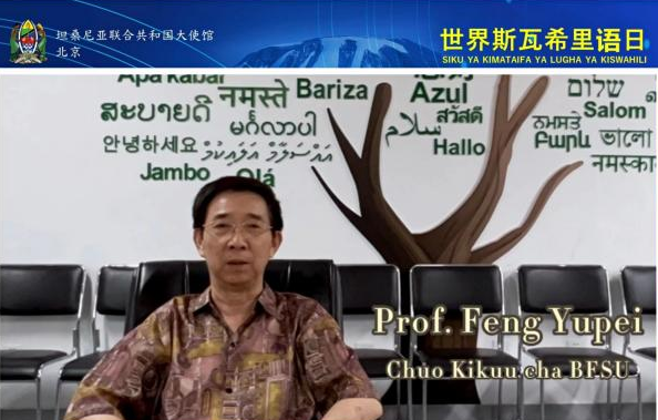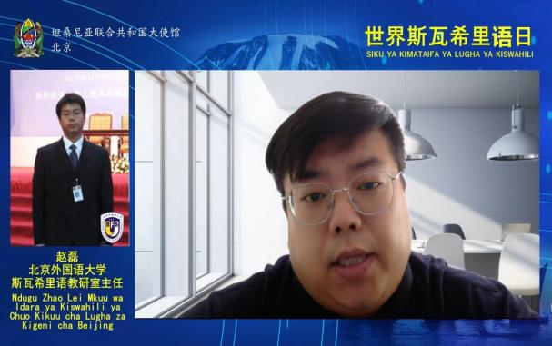 公司斯瓦希里语教研室主任赵磊在发言中回顾了北外斯瓦希里语专业60年的发展历程以及在人才培养、教材编写、课程建设、文学译介和国际交流与合作方面所取得的成就。冯玉培教授和员工代表唐旭康、张雨霏通过视频表达了对世界斯语日活动的祝贺。冯玉培教授在贺辞中表示,斯瓦希里语是第一个被联合国官方专门设立纪念日的非洲本土语言,这一举措极大地鼓舞了全球1亿多的斯瓦希里语的使用者、学习者和爱好者,意义重大。随后,2020级斯瓦希里语的8名同学深情朗诵了坦桑尼亚著名诗人夏班·罗伯特(Shaaban Robert)创作的诗歌《斯瓦希里语》。诗中将斯瓦希里语比作母亲,哺育着东非广袤土地上的人民,同时表达了对于斯瓦希里语日益走向世界的自豪之情。