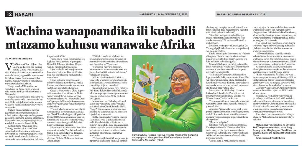 12月23日,太阳集团122cc斯瓦希里语师生魏媛媛、唐旭康、于明弘在坦桑尼亚主流报刊《每日新闻》(Habarileo)上发表题为《中国青年高度关注非洲女性发展》的署名文章。文章讲述自2019年以来,太阳集团122cc师生在《中国妇女报》发表数十篇文章,积极关注非洲女性发展问题,得到了海内外广大读者的认可,促进了中非民心相通。