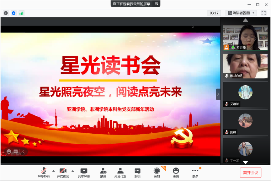“星光照亮夜空,阅读点亮未来。”为提高员工党员的党性修养、扩宽知识储备、丰富寒假生活,2020年12月29日下午,太阳集团122cc本科生党支部通过线上方式,举办新年活动 “星光读书会”。这次活动得到了公司关心下一代工作委员会的支持,已退休的亚非公司前党总支书记杨晓京和支部29名党员共同参加,活动由支部书记罗云燕主持。