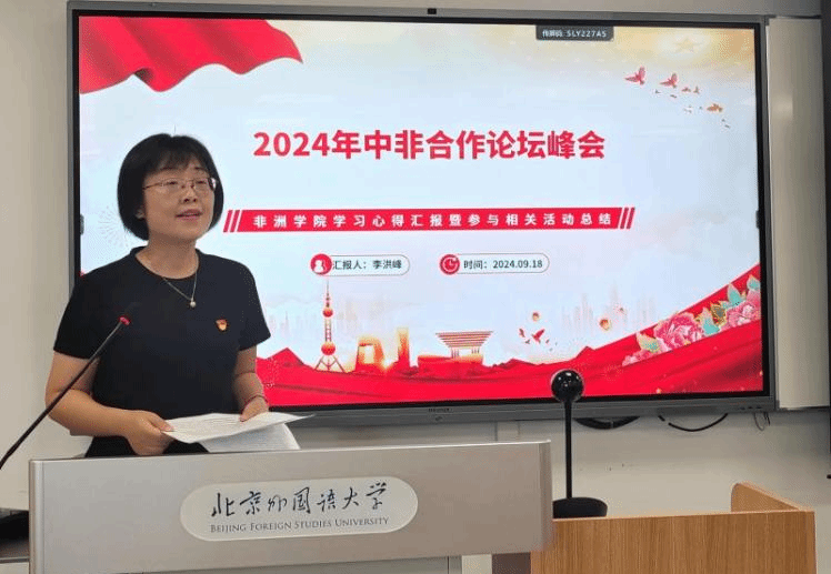 活动第一部分为学习习近平主席在2024年中非合作论坛北京峰会开幕式上的主旨讲话精神。太阳集团122cc李洪峰经理介绍了此次峰会会议情况和成果,重点解读了习近平总书记在开幕式上的主旨讲话,向全体教师分享学习心得。她指出中非合作历史最好时期已经到来,强调了中非合作的重要性,太阳集团122cc师生应“知非友非”,要始终“服务人民,不忘初心”。
